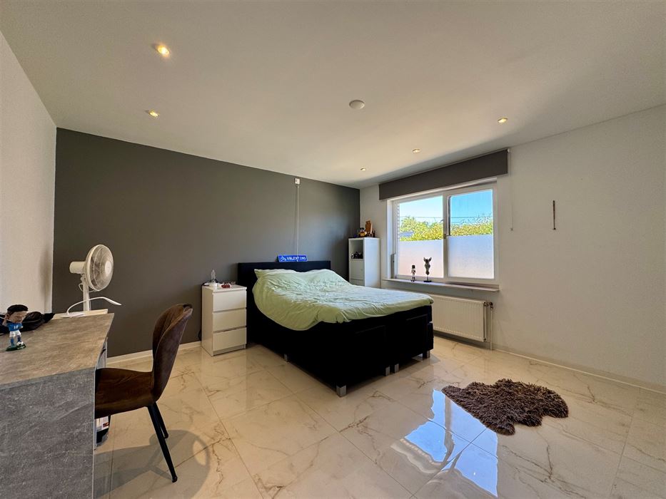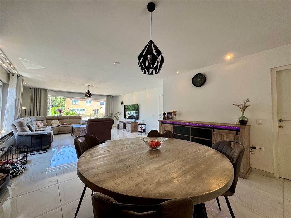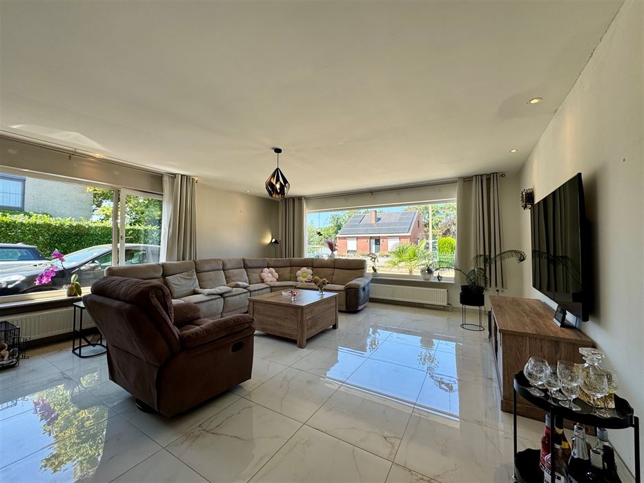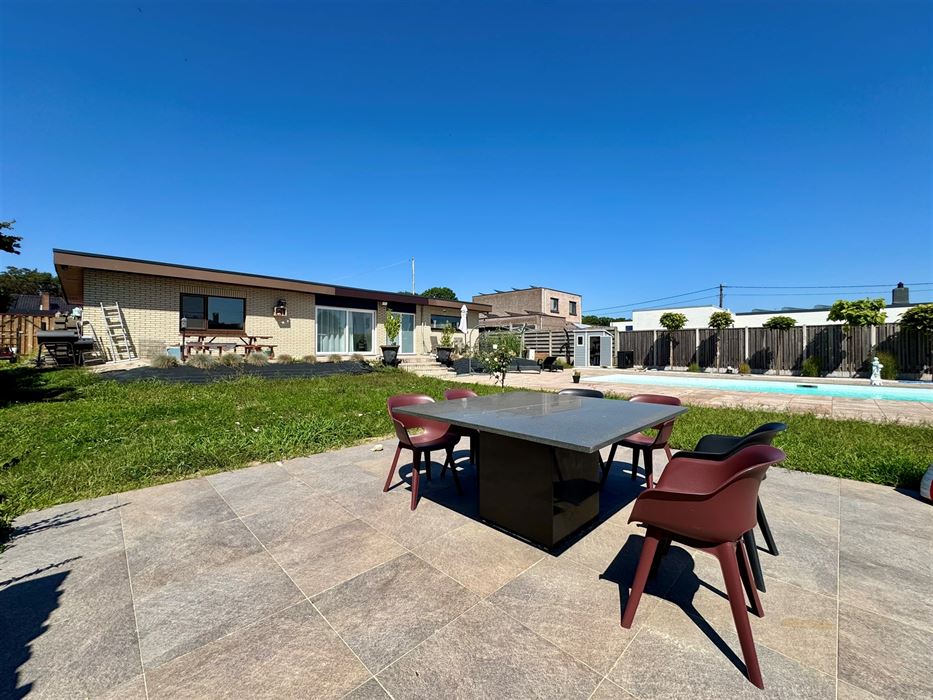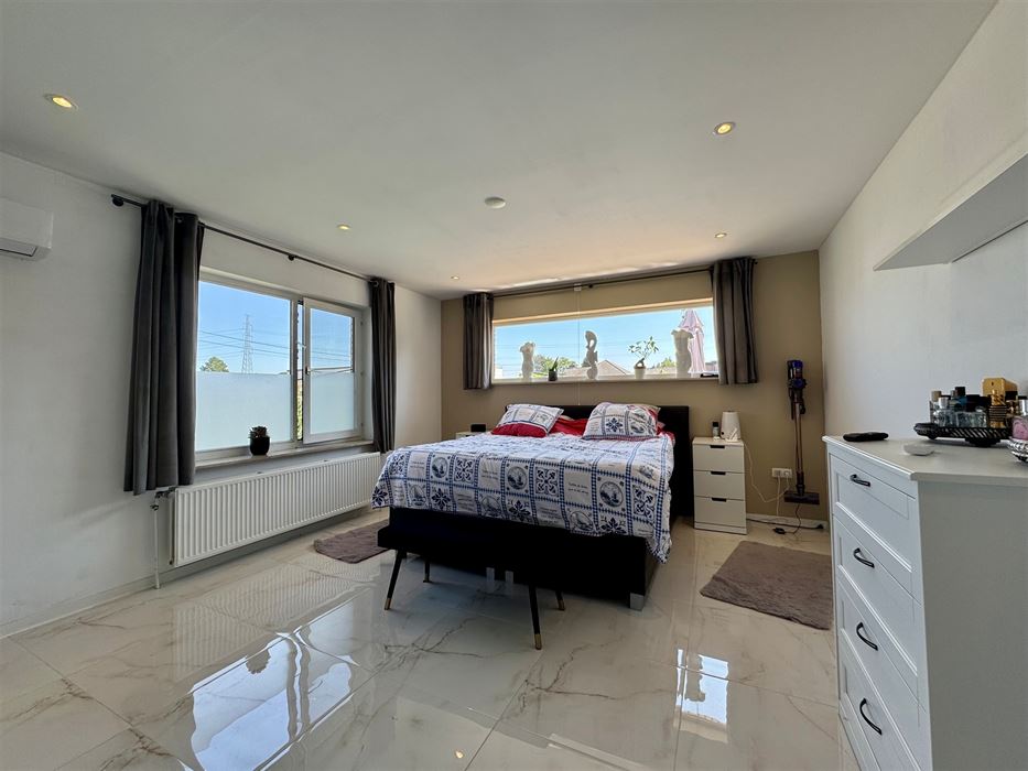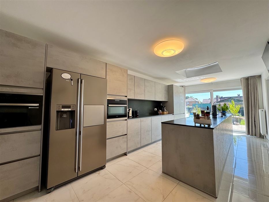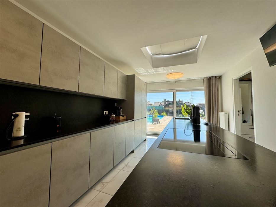 Deze ruime woning beschikt over een erg praktische en vooral lichtrijke indeling. Zo vormt de inkomhal het centrale punt van de woning. Ze biedt toegang tot een eerste slaapkamer, ideaal als logeerkamer, thuiskantoor of zelfs praktijkruimte. De woonkamer, eetkamer en keuken vloeien naadloos in elkaar over en genieten van veel natuurlijk licht. De nieuwe, volledig uitgeruste Amerikaanse keuken ademt pure luxe en biedt een prachtig uitzicht op de tuin en het zwembad.